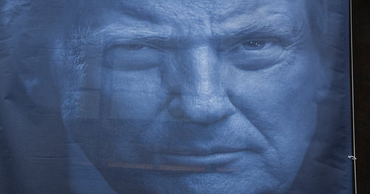 On Thursday, a large banner featuring the face of President Donald Trump was hung over an entrance to the Justice Department building in Washington, D.C.